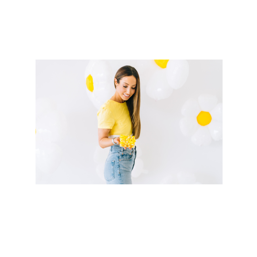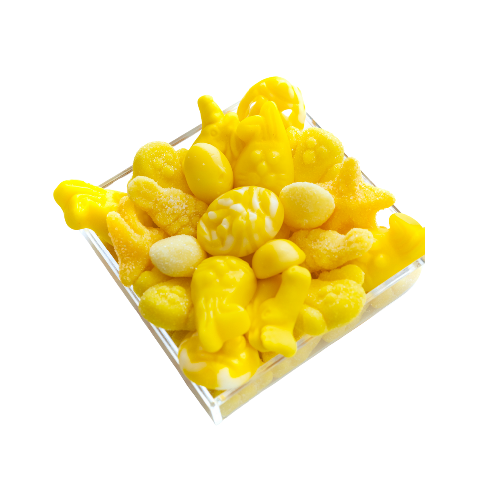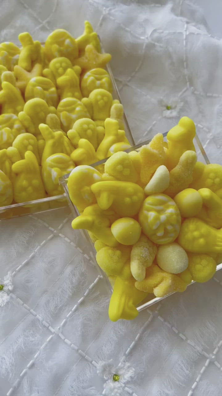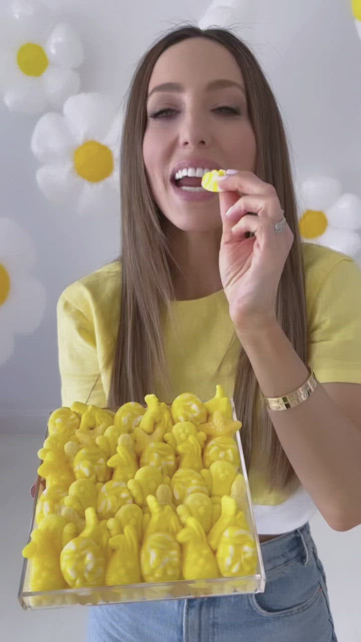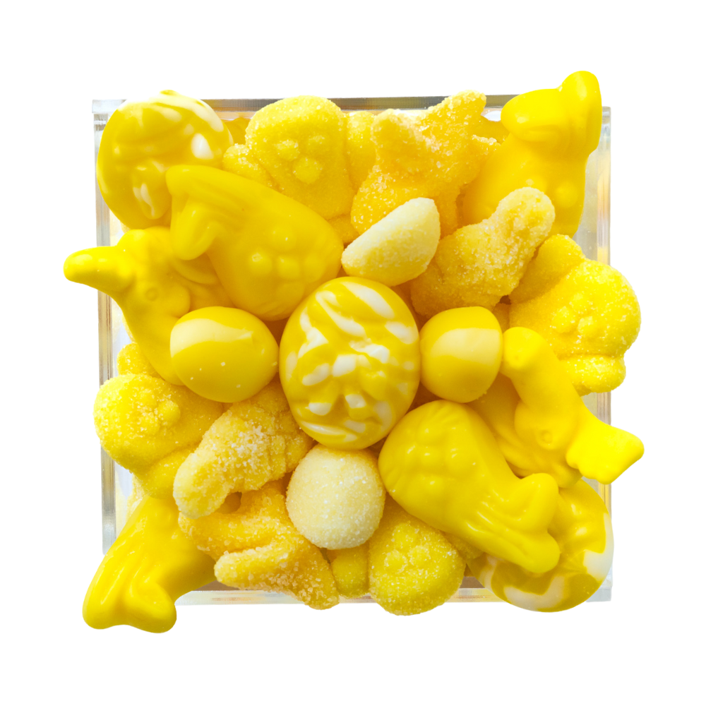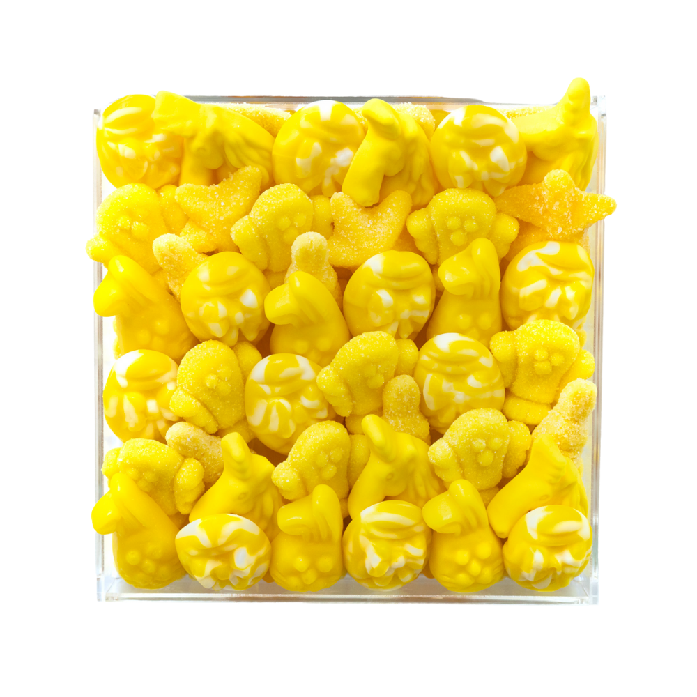 A delicious and bright you are my sunshine gift, this candy board is a great way to welcome a new addition or have as part of the dessert display at a gender-neutral baby shower. Showcasing cute chicks and bunnies and light flavors like lemon and strawberry on top, this candy board also features a surprise selection of sweet and sour gummy bears underneath.