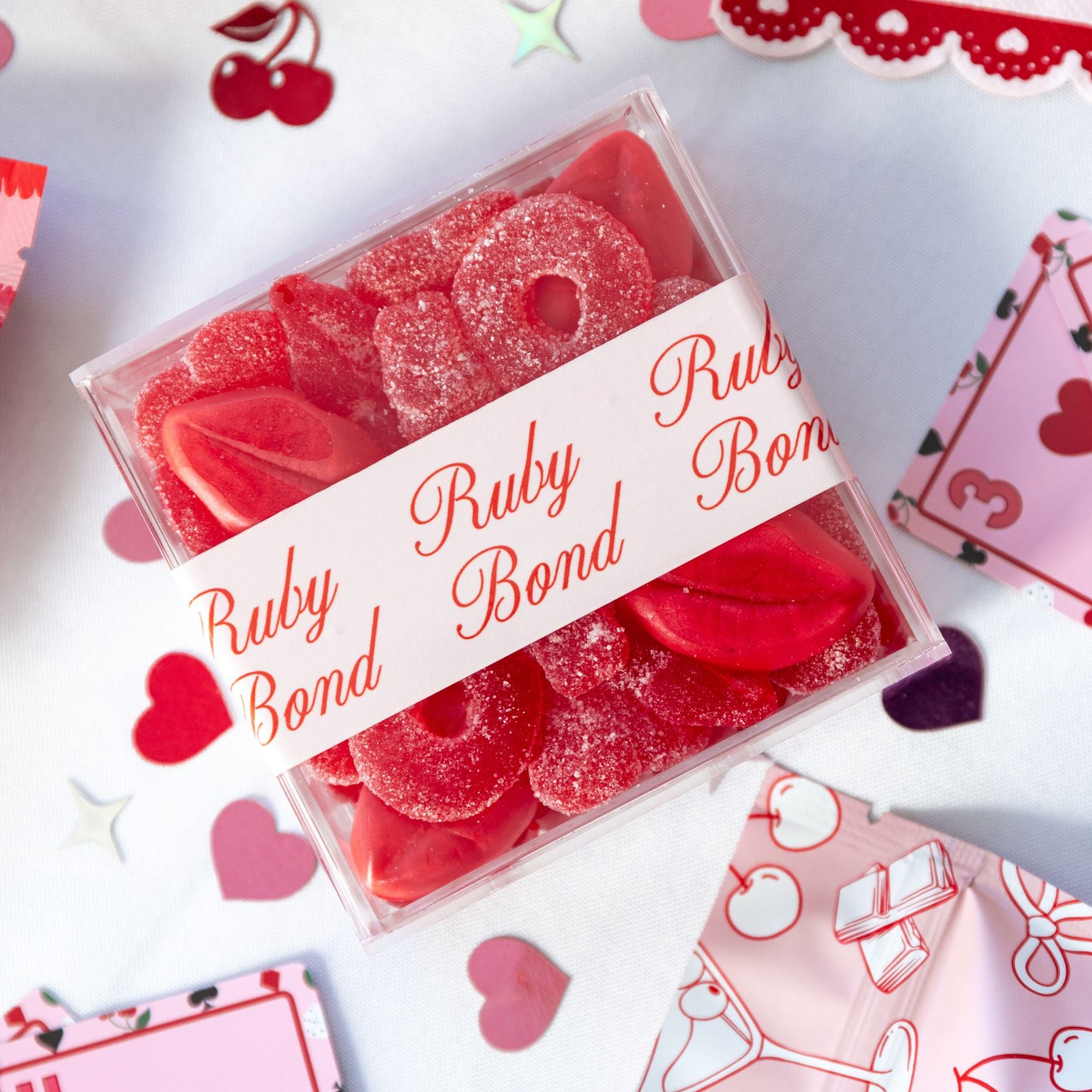This Valentine's Day is extra juicy with this cherry flavored candy board. Sweet and sour cherry lips and hearts bursting with flirty flavor. The sweetest gift for you friends and loved ones.