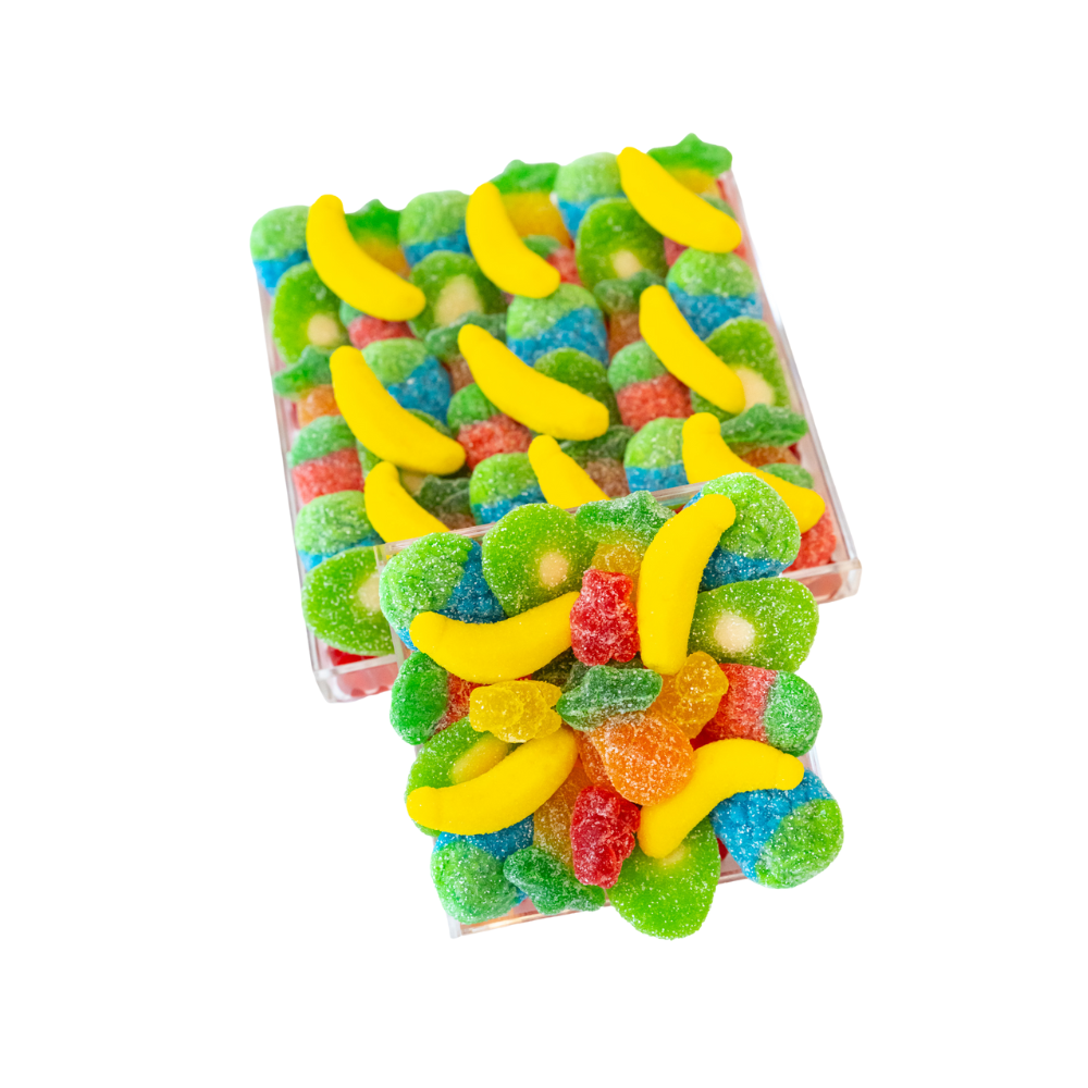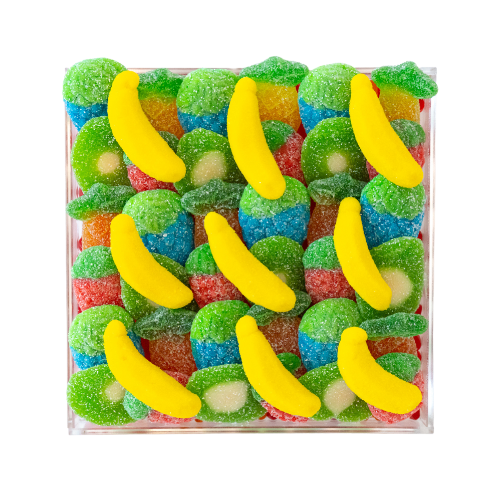 Sour strawberry, sour blue raspberry, sour kiwi, pineapple, banana, cherry and orange.