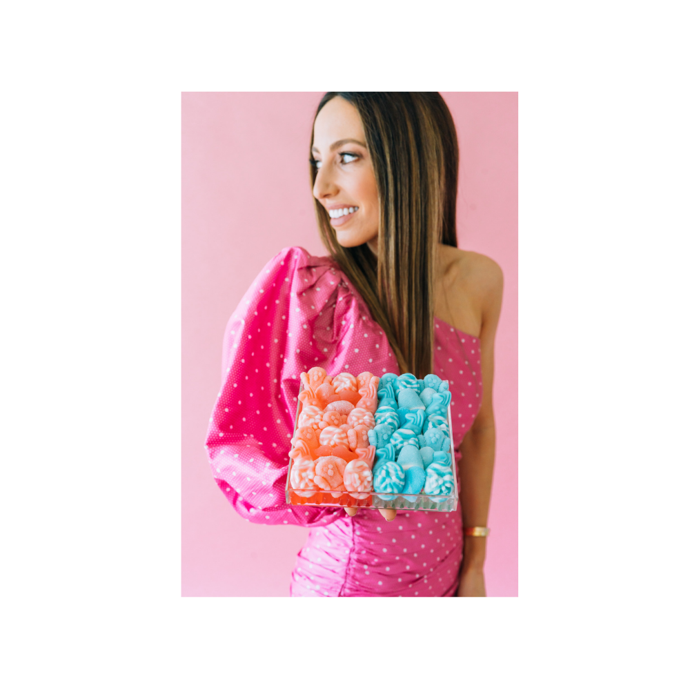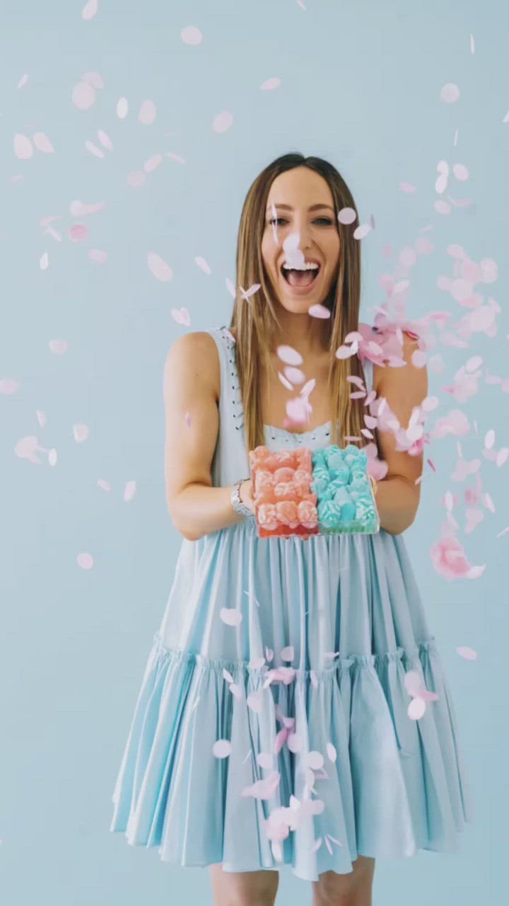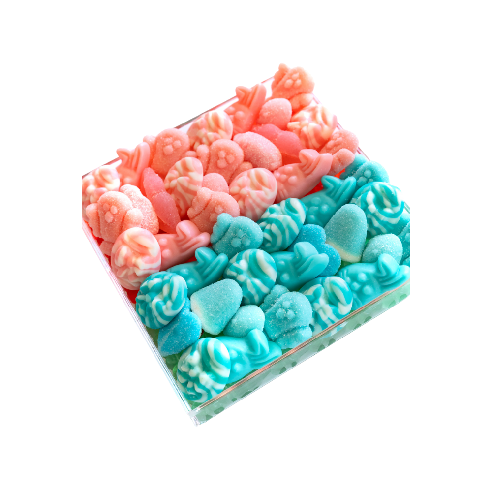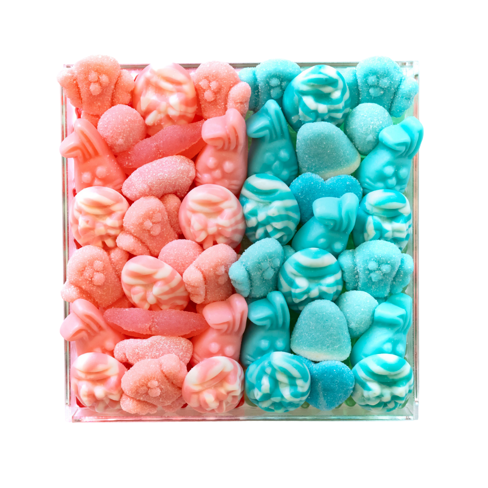Team pink or blue?! With this sweet candy board, there’s no need to choose. You can have them both! Perfect for a gender reveal party or baby shower, your guests will love the nostalgia of eating gummies for dessert. This candy board, lined with a surprise selection of sweet and sour gummy bears, is also a great gift for welcoming twins to the world!