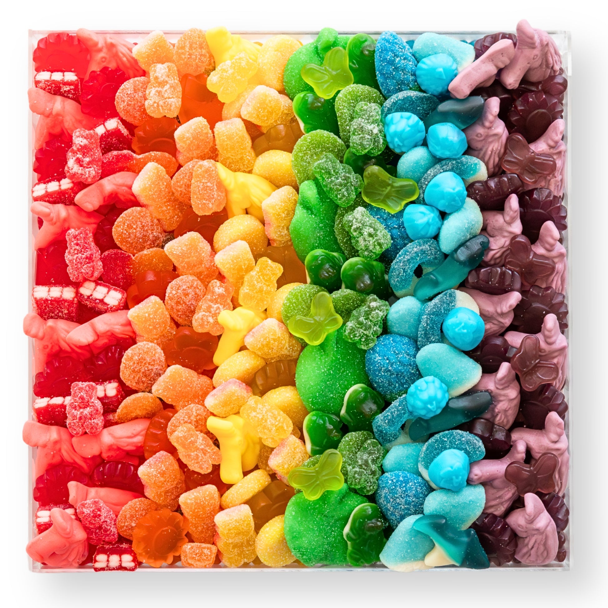 Ingredients: Sugar, Corn Syrup, Glucose Syrup, Water, Gelatin, Acidifiers (Citric Acid, Lactic Acid, Malic Acid, Fumaric Acid, Sodium Hydrogen Malate), Humectant: Glycerol, Modified Corn Starch, Cochineal Extract, Palm Oil, Coconut Oil, Carnauba Wax Leaf, Beeswax, Pectins (derived from fruit), Titanium Dioxide, Natural and Artificial Flavors. Colors: Turmeric, Fruit and Vegetable Juice (Radish, Tomato, Apple, Pumpkin, Carrot, Black Currant) FD&C Blue #1, FD&C Yellow, Blue 1, FD&C Red # 40, Yellow 6, Yellow 5