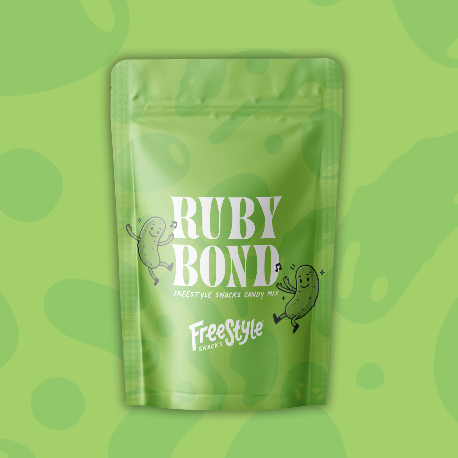 This limited-edition collab pairs a standard-size Ruby Bond Candy Mix with a bag of Freestyle Snacks Classic Dill Pickle Chips, all wrapped in matching, playful packaging that was made to be gifted, shared, or devoured solo.
