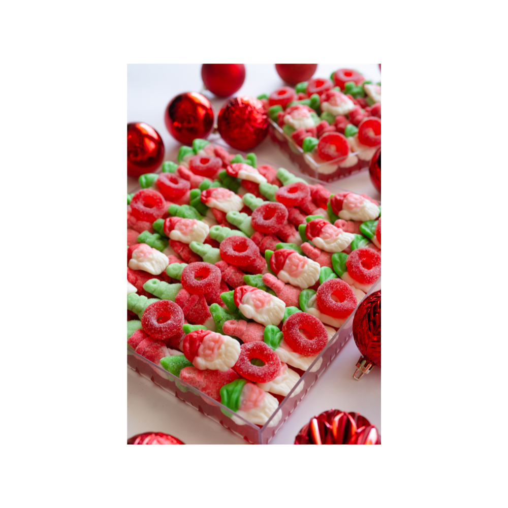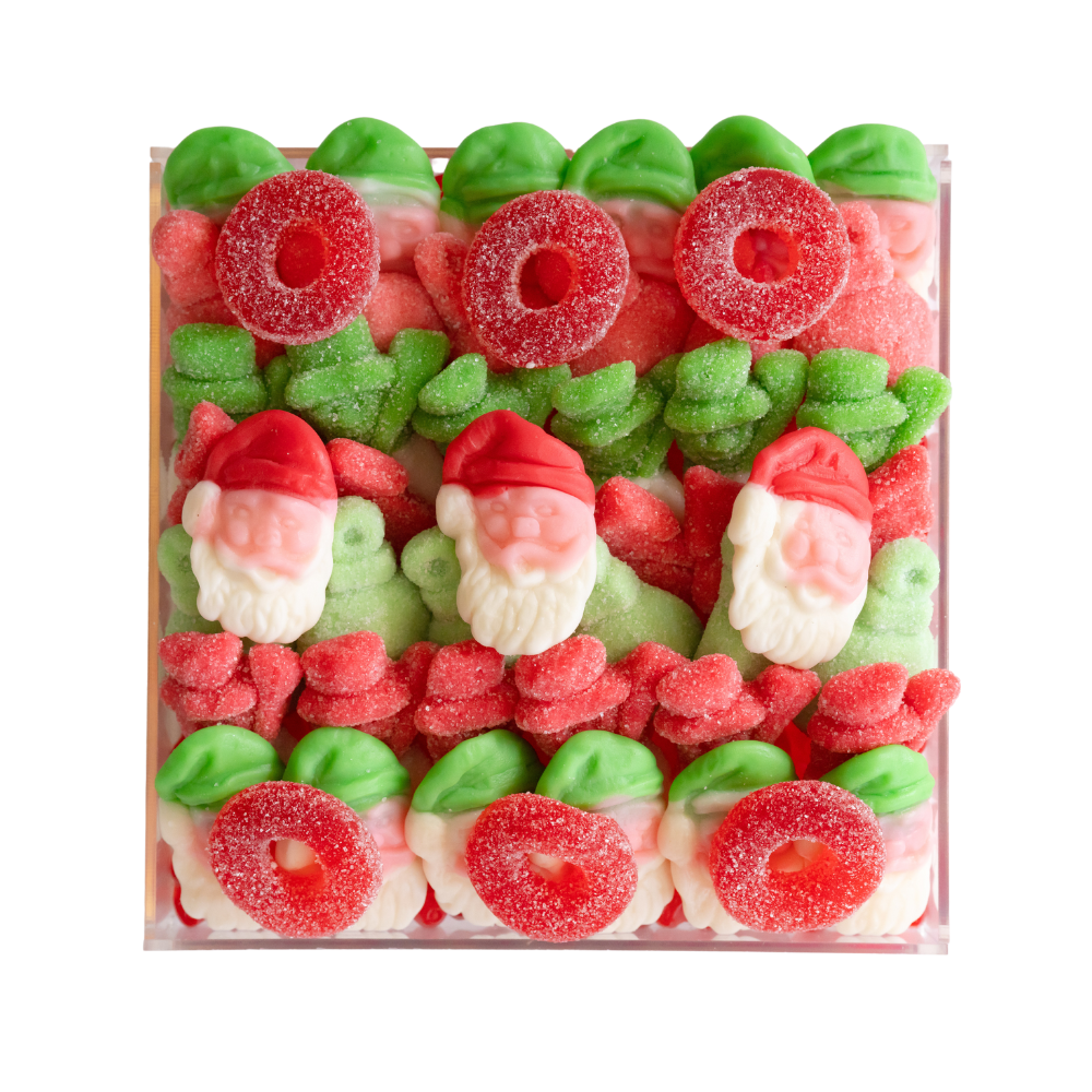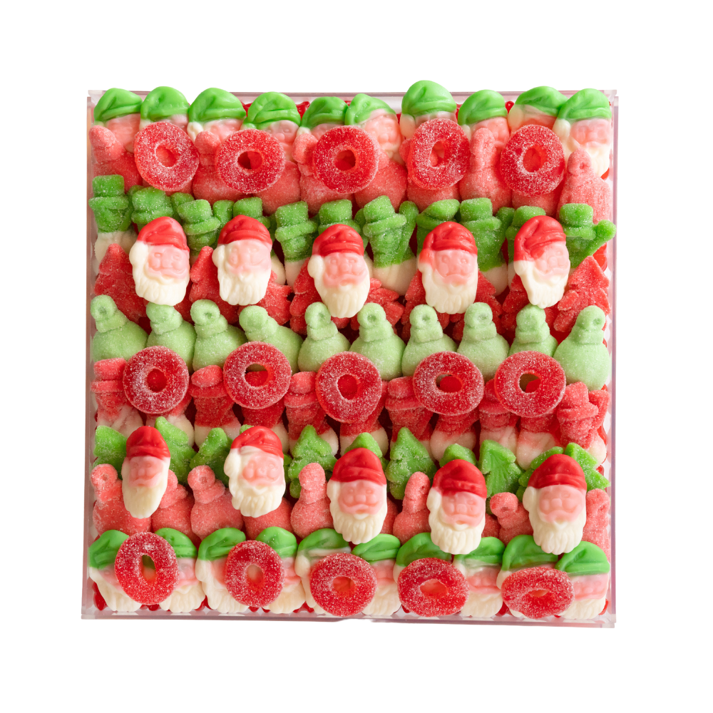 Uncover the magic and delight in this candy board for the holiday. Seasonal candy of Santas, ornaments, snowmen and more, makes this sweet treat festive and delicious. This taste of Christmas makes the perfect stocking stuffer, gift under the tree, wishing you a merry merry, and everything in between. Our large size is a must have for every Christmas party and family gathering. Plus, it’s lined with a surprise selection of sweet gummy bears.