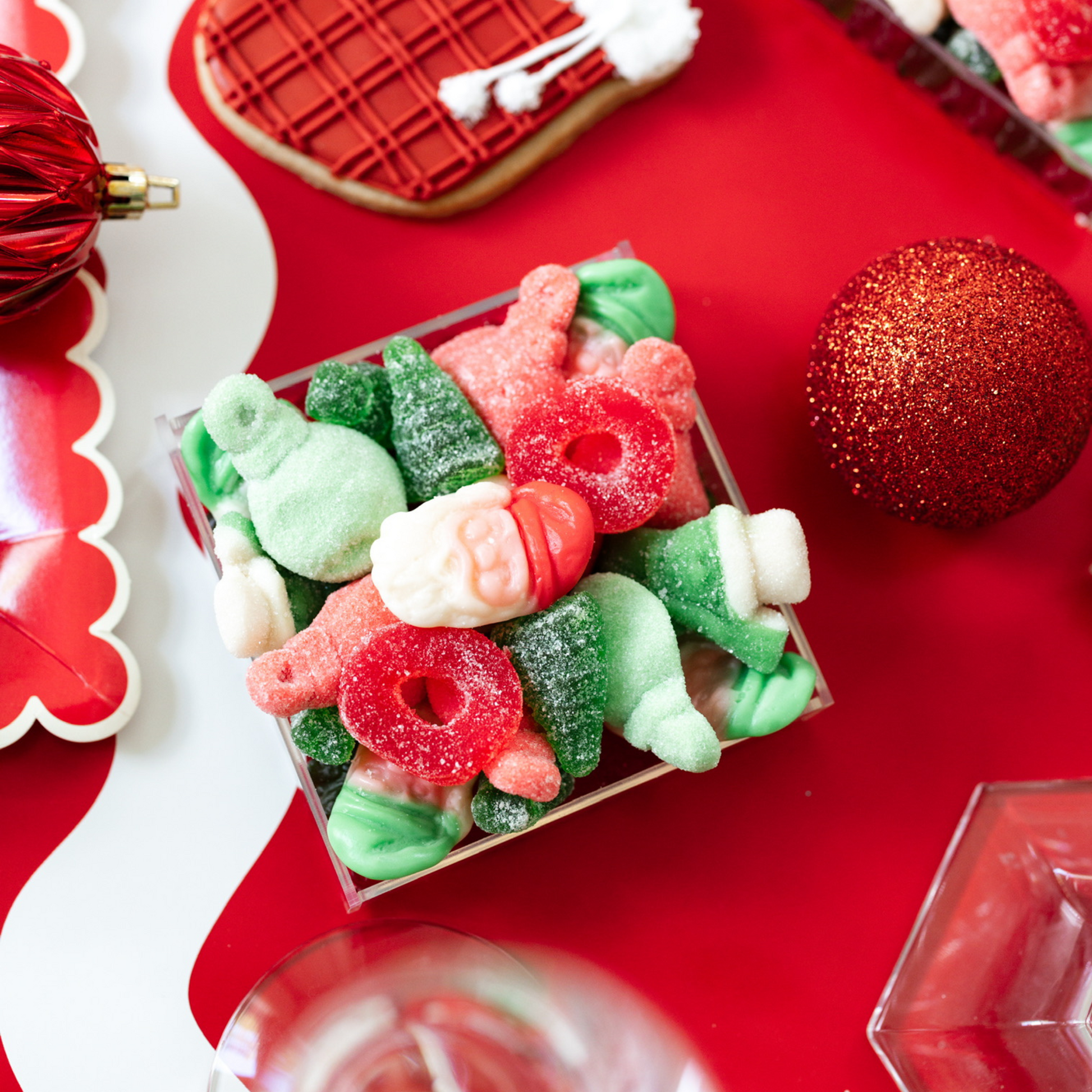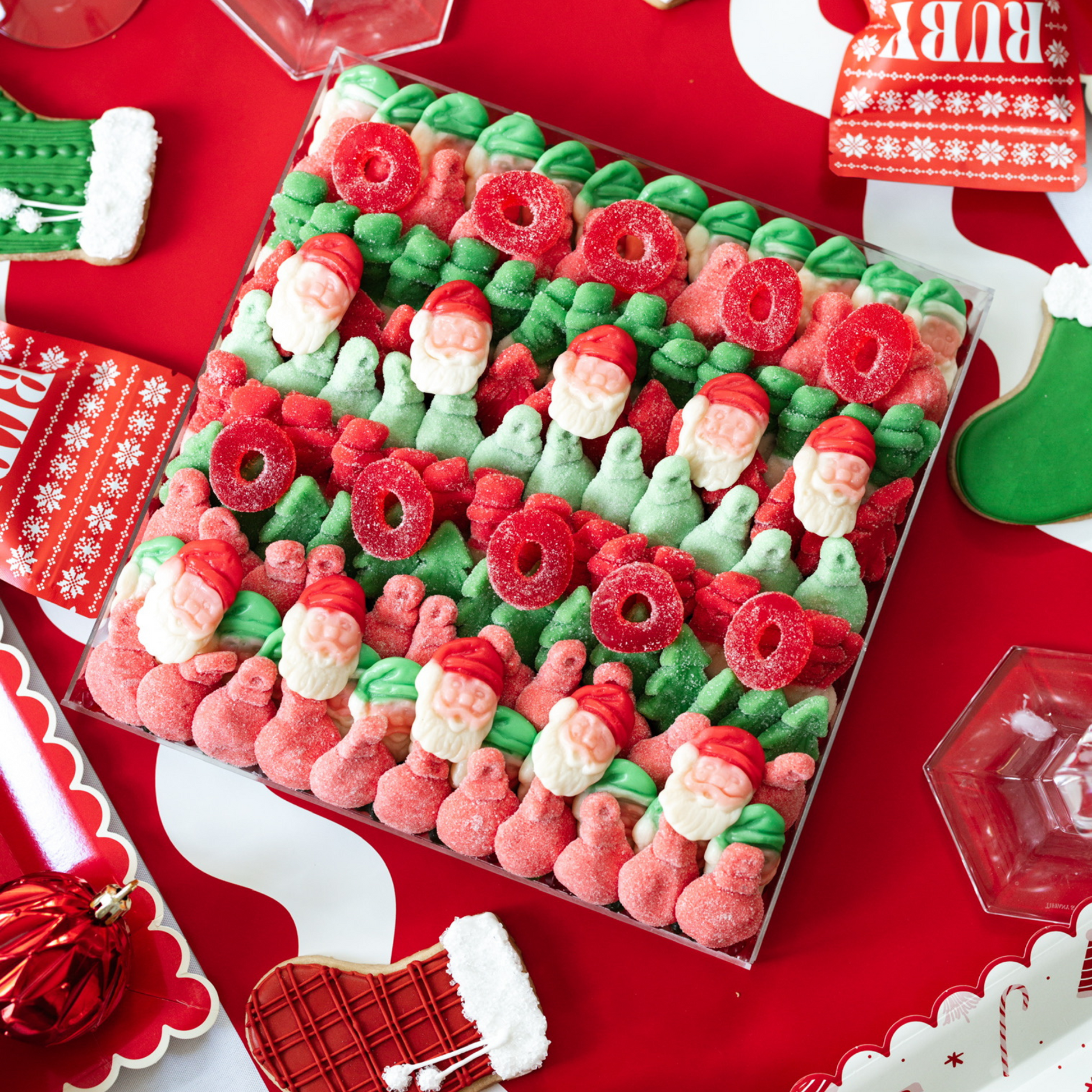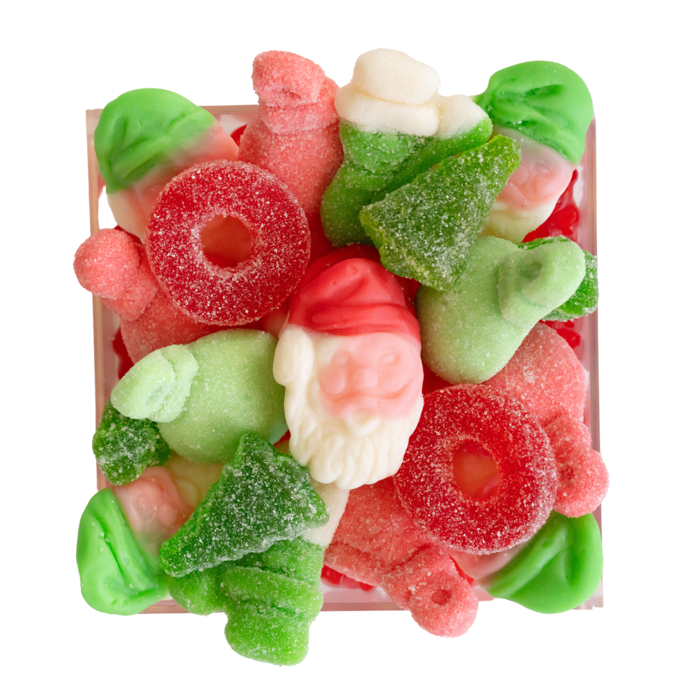 Uncover the magic and delight in this candy board for the holiday. Seasonal candy of Santas, ornaments, snowmen and more, makes this sweet treat festive and delicious. This taste of Christmas makes the perfect stocking stuffer, gift under the tree, wishing you a merry merry, and everything in between. Our large size is a must have for every Christmas party and family gathering. Plus, it’s lined with a surprise selection of sweet gummy bears.